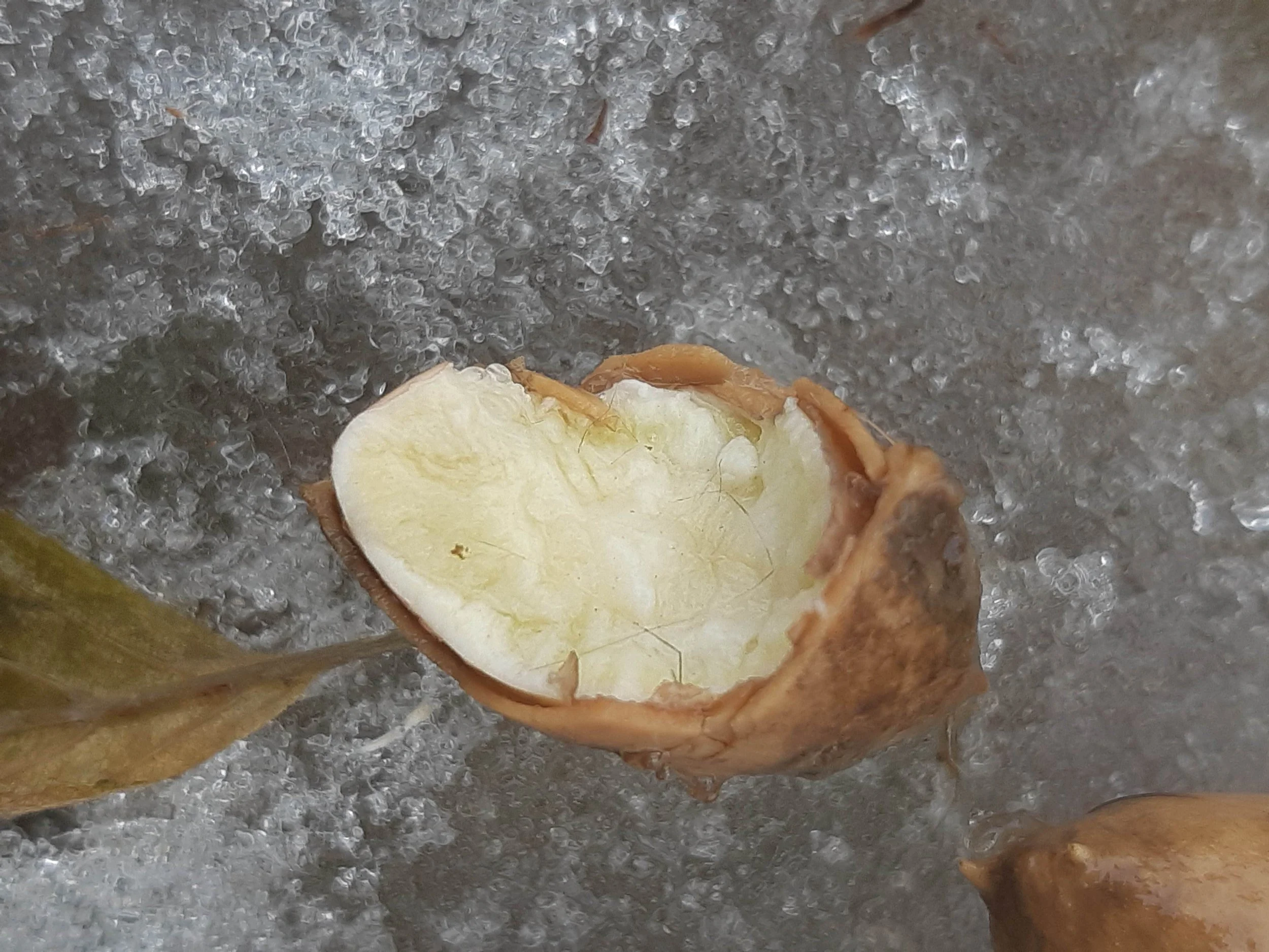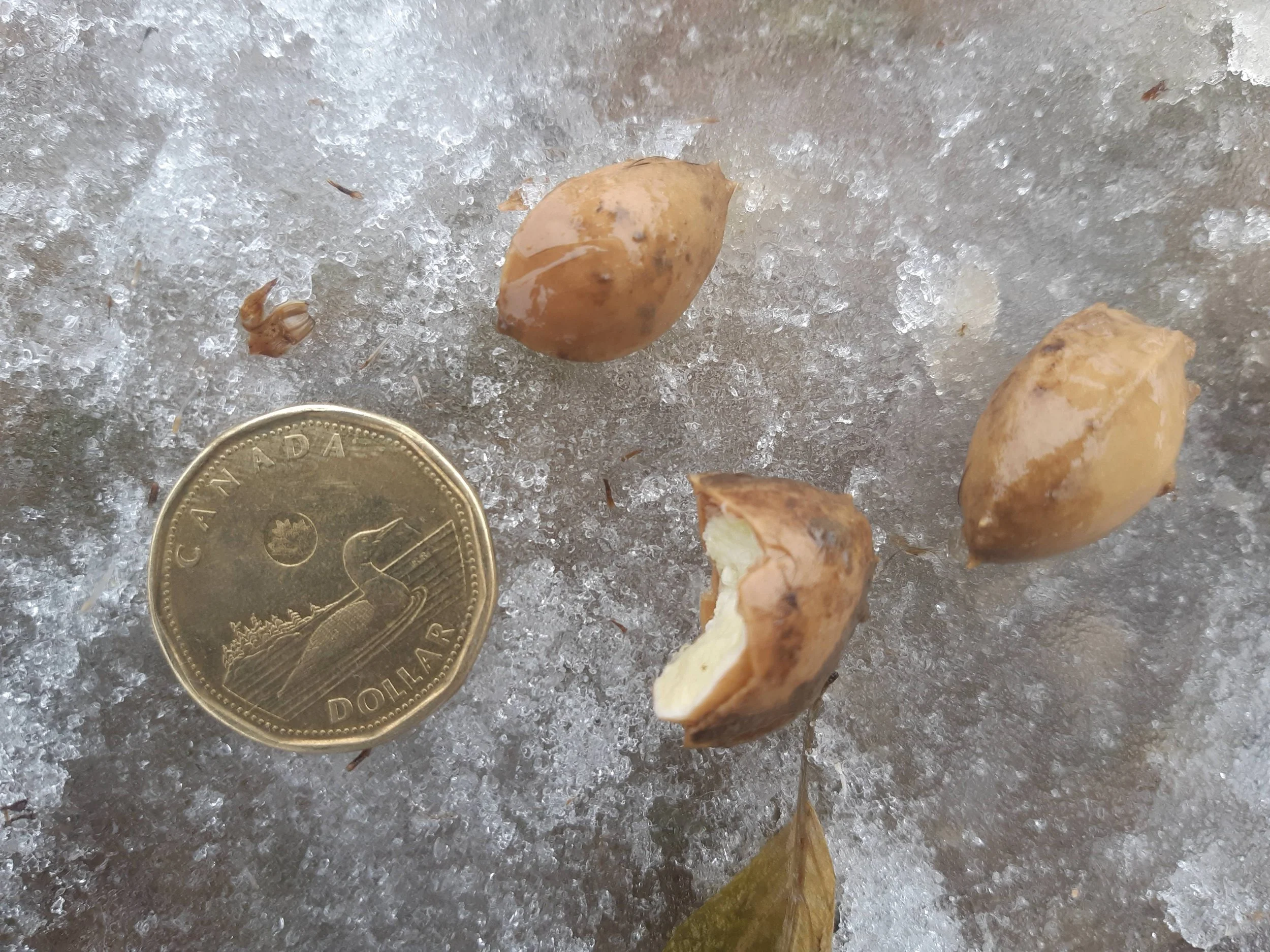 For a few years the quest continued a quiet way. As I flipped through pages of books, or read things online I would see the same colour, or shape of some seed which reminded me of seeds from the scat. In 2021 I took time to specifically focus on seeds and fruit, all the while wondering who the mystery pit belonged to. Was it a Hickory (Carya spp.) nut of some kind? No, but they look quite similar. Was it a Peach (Prunus persica) pit? No, Peach pits are ridged and rough, while the unknown seed was smooth with three simple ridges. What could it have been?