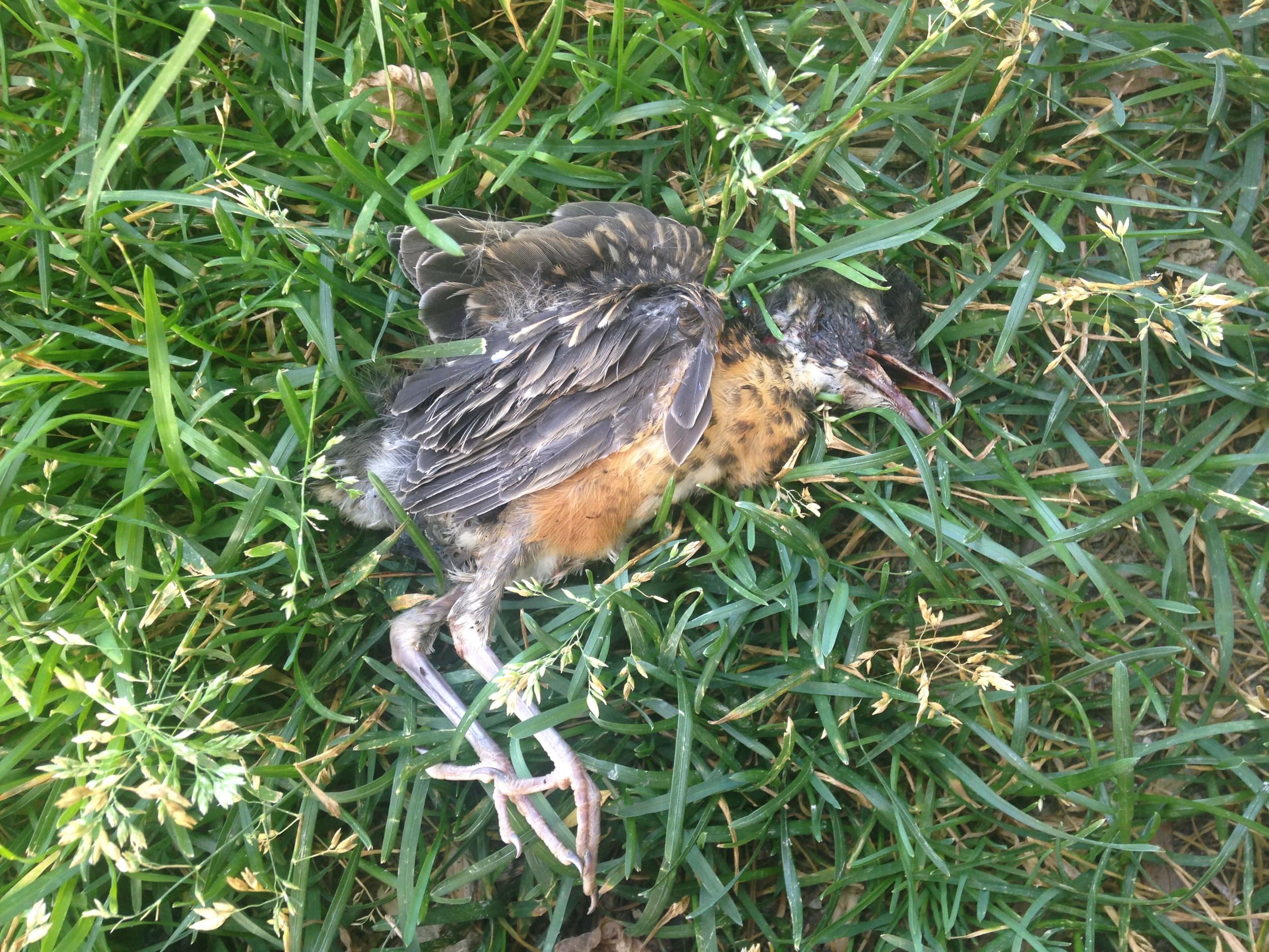 I just happened to catch a darker shape on the grass, and peered around my partner to get a better look. There it was, a freshly dead juvenile American Robin (Turdus migratorius). I had all sorts of assumptions of what had happened, like perhaps a Dog (Canis familiaris) had run up and got the young unexperienced bird while the bird was on the ground? I have seen it before. Or perhaps a Cat (Felis catus) did the same? Outdoor cats are consistently killing wildlife and this was a residential neighbourhood so this would also make a lot of sense. Oh, and I knew it was a juvenile from the dark spotting on the orange breast, and also the head looks like it isn’t as fat or big though this was more of a feeling.