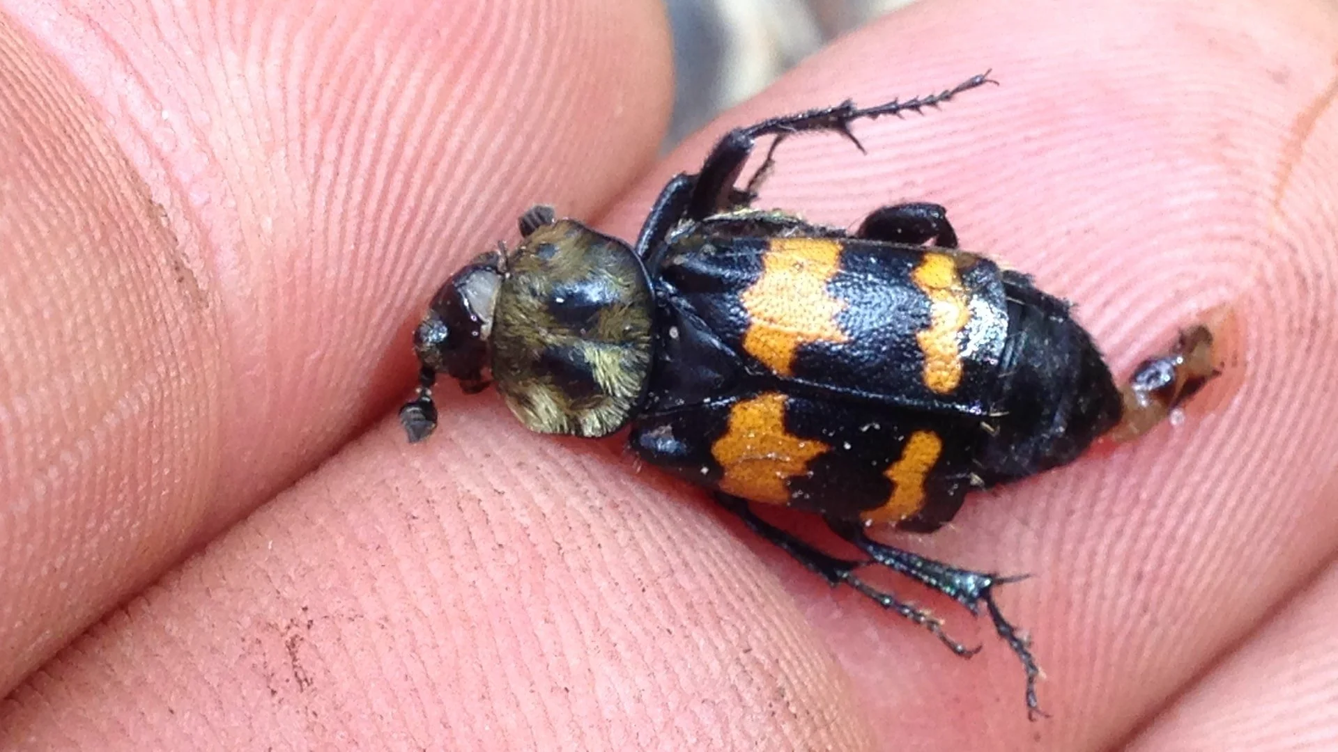 This was such a limited view of the animal, but I had a guess as to the family. I thought it was likely a Carrion Beetle (Silphidae) as they were crawling around near a dead bird, and suddenly trying to burrow down, as opposed to crawling away, when I moved the carcass, and their overall shape and size. But they looked different from the Carrion Beetles I most often see, the American Carrion Beetle (Necrophila americana). Instead this one had seemingly longer elytra (modified wings/wing covers) and the black Charlie Brown zig-zag and orangey-yellow Batmanish “Bat signals” patterns on the elytra. I ended up moving the grass enough to be able to pick up the beetle so I could take some photos. That obviously meant letting this animal, known and named for the fact that it crawls in and on dead things, crawl on my body. Yum.