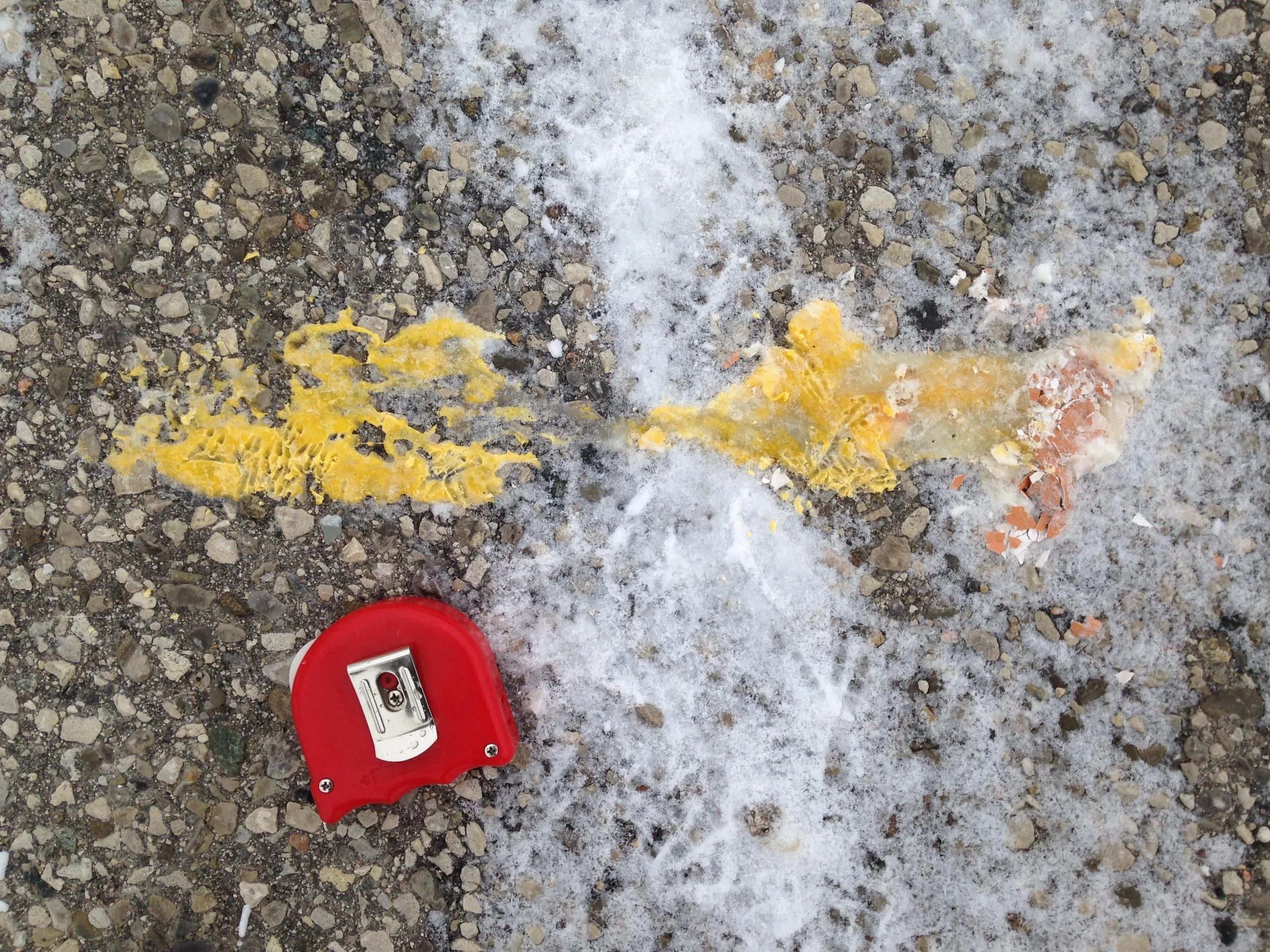 Frozen yolk on in the parking lot. Tape measure is 7 cm across.