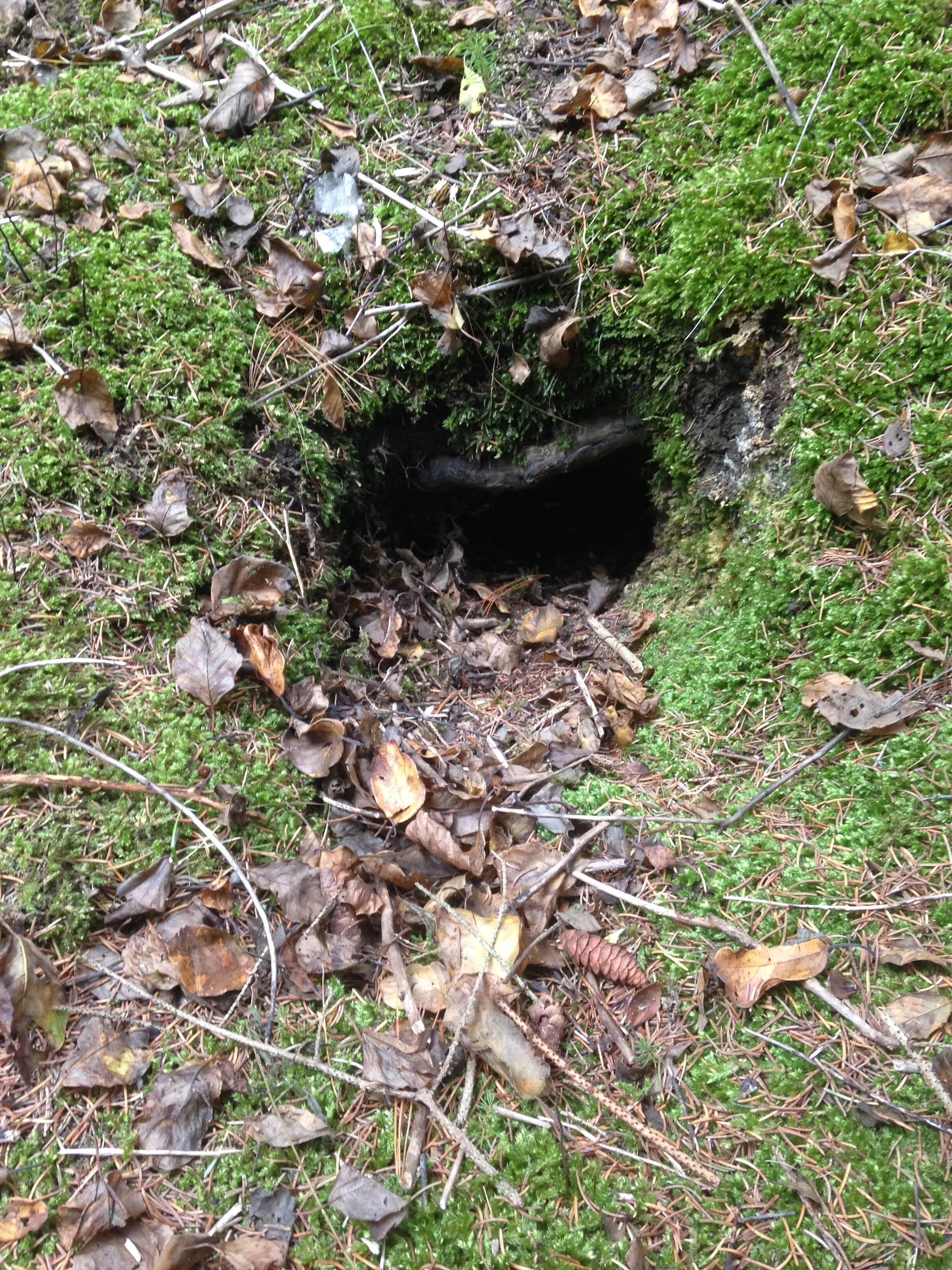 Possible Groundhog burrow underneath the Glossy Buckthorn(?). Entrance was about 14 cm tall. I could fit my arm most of the way.