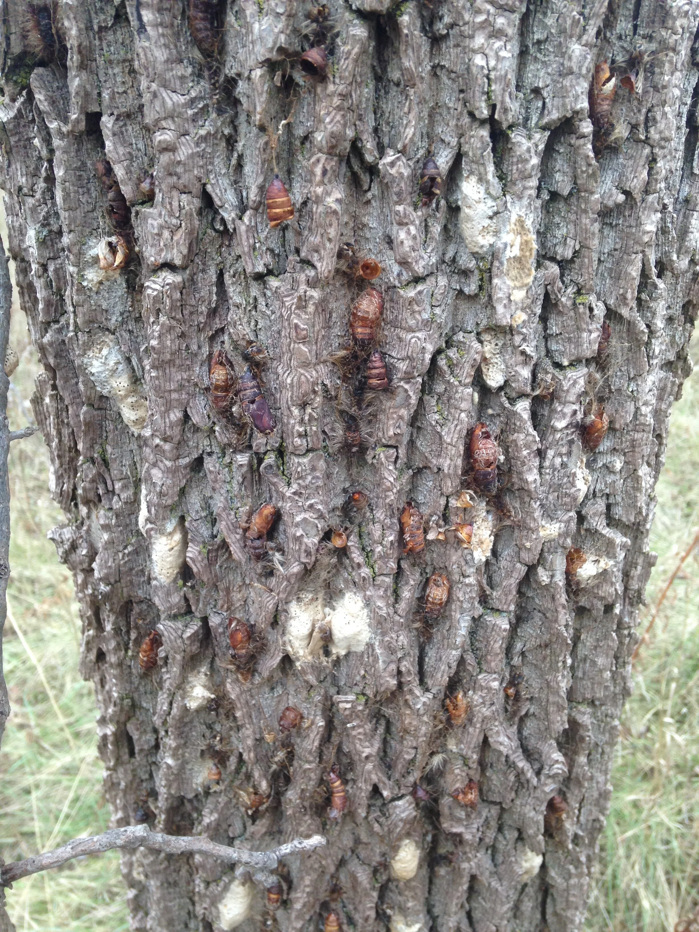 At this time two of our crew had to leave, but the five of us walked along through the outer edges of the Turf Grass Institute and checked out some faint trails in the grass (averaging 11 cm trail width), and looked at a Gypsy Moth (Lymantria dispar dispar) infestation on a Black Walnut (Juglans nigra). Gypsy Moths, if you don’t know, aren’t from here and because of that have fewer natural predators in our area. They, like all caterpillars, eat plants and the leaves of trees and shrubs. With few natural predators, sometimes Gypsy Moth caterpillar populations keep growing, keep feeding on plants and leaves and there are concerns that they may defoliate trees entirely. A tree can handle one or two years of defoliation if they are strong and in good health, but after a couple of years of no food (can’t make sugars without photosynthesis from the leaves), the trees could succumb to the Gypsy Moth infestations. We wondered together, who, if anyone eats the Gypsy Moth and if we humans could be eating the Gypsy Moth eggs as a biological control mechanism?