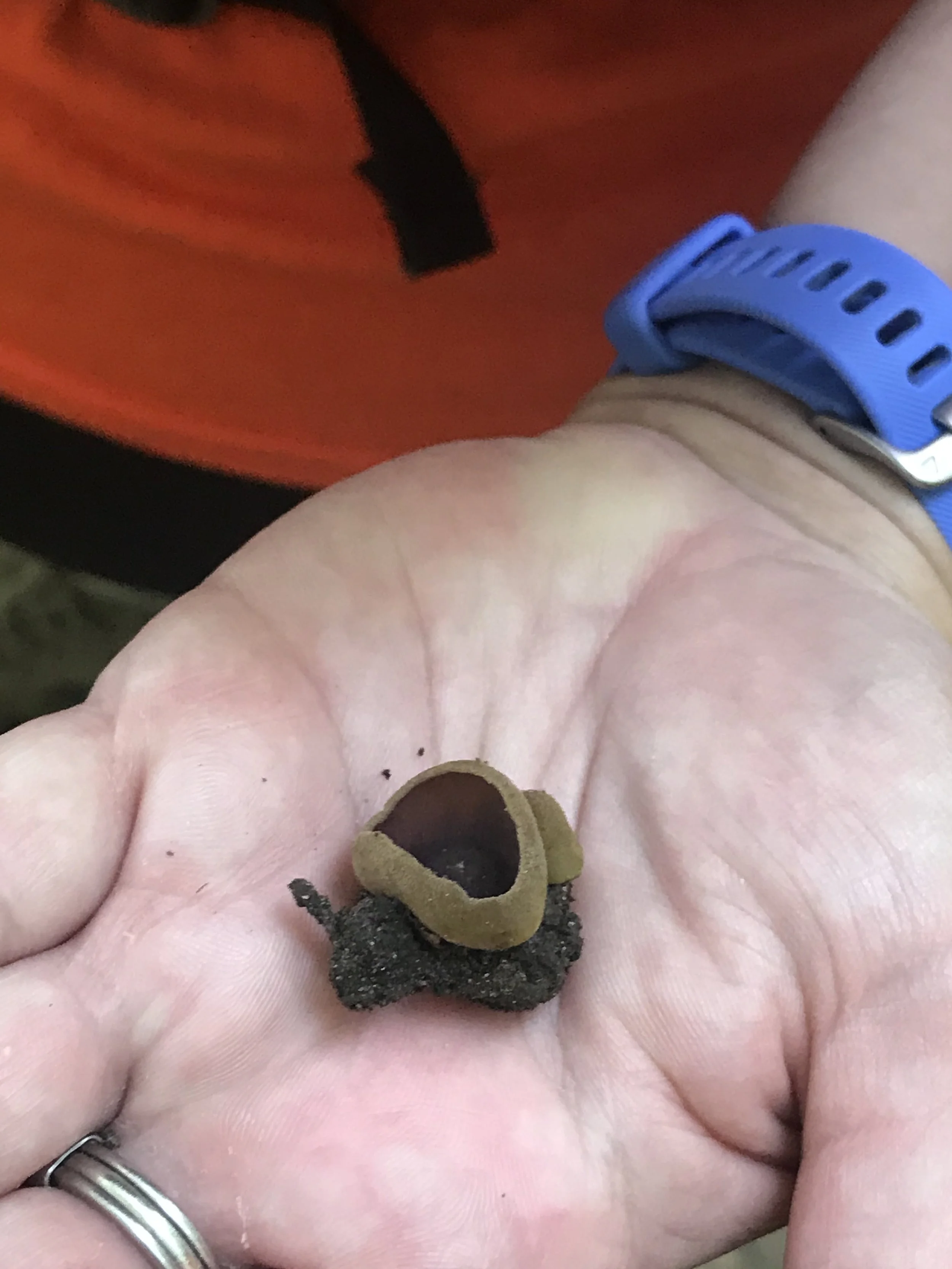 In short time I saw someone purposefully walking out of the forest and I went over to meet him, assuming he was the lead of our walk that day. I was correct, and Carl introduced himself and was sure to help me feel comfortable and welcome at my first outing. As everyone started to arrive we circled up, and then quickly made our way into the woods. Almost as soon as we did Carl bent over and pulled up a Cup fungi which was in the genus Peziza, but it may actually now be called a Paragalactinia michelii cup fungi. These fungi have a very bowl or cup like shape, and usually grow solitary or in groups, found growing on soil in woods, parklands and stream banks. I did not see where Carl had plucked them from, but we were in a mixed forest at the time so it would make sense.