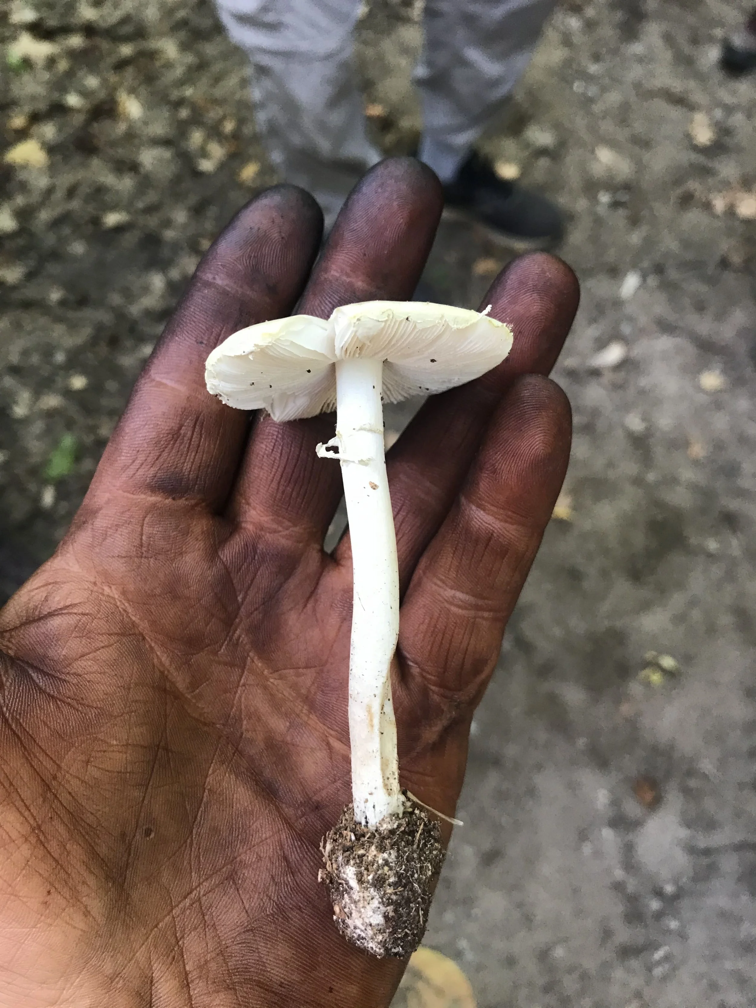 Everyone knows there are deadly poisonous mushrooms to be found, but it's still exciting when we do come across them. One of the well known genera with toxic mushrooms are the Amanitas. The toxic component is called Amatoxins. It is these amatoxins which enter the bloodstream and damage internal organs, but it's really the damage done to the heart, kidneys and especially the liver which is likely to kill you (these are the first organs the toxins encounter after being digested). They are taken up in the liver, and then excreted through bile into the blood, then back to the liver, causing a cycle of poisoning. The amatoxins break down cell walls. If the cells in the liver or heart are damaged, this can cause the cells to breakdown quickly and cause the liver or heart to literally dissolve. The acute symptoms can include headache, nausea, coughing, diarrhea, and lots of urination. After about 12-24 hrs, there is an eye of the storm moment where all appears to be well, but after this second 12-24 hr period of calm, the liver and kidneys start to fail, and death can happen on the second day after being poisoned. There have been cases of survival from around the world, but it seems measured by the amount of deaths associated with these mushrooms. For these reasons, the information above makes me want to learn more about the Amanitas and how to identify them properly. Thankfully Carl shared some pointers. He told us to look for the volva, or egg-like structure at the base of the stipe from where the mushroom emerged. He also said to look for a ring around the stipe below the cap. This ring is the remnants of a thin veil which concealed and protected the gills while the spores were developing. He told us that Amanitas usually have pale gills, which are freely attached, and leave a white spore print. He even told and showed us how he uses a drop of potassium hydroxide or KOH which he gently places on the flesh of the mushroom to help in determining identification. The KOH can change the colour of the fungi where the drop was placed, and for Amanita bisporigera, the flesh can turn yellow. Amanita bisporigera is commonly known as The Eastern North American Destroying Angel, which just makes it more intriguing.