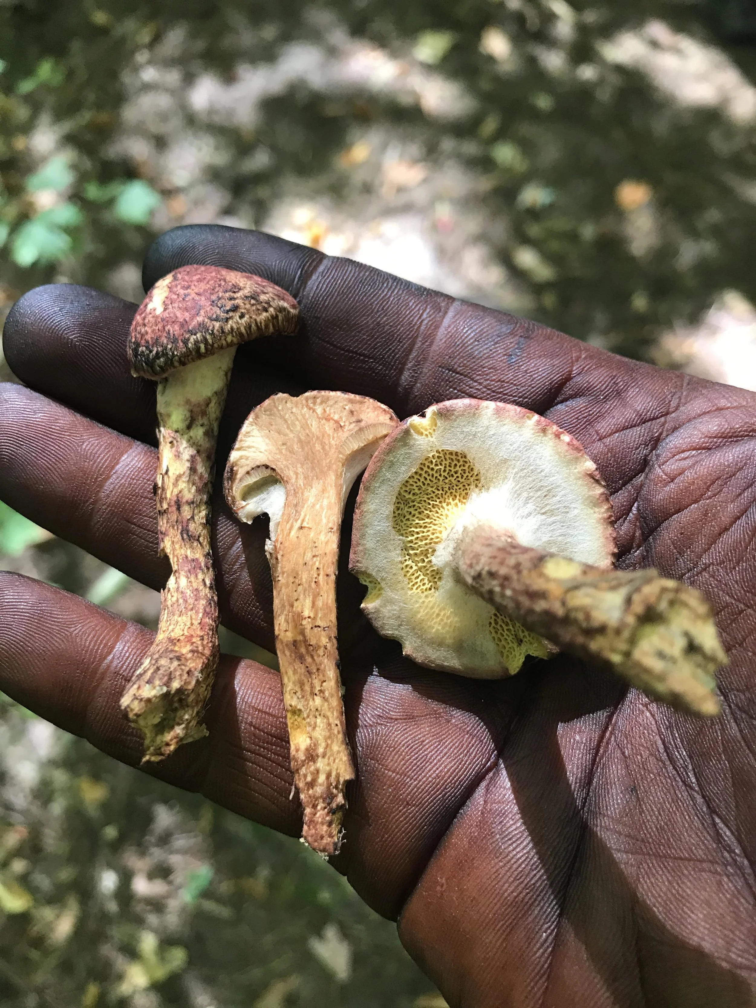 Other notable species we found on our introduction to mushroom identification were Trembling Polypore (Phlebia tremellosa), and the lovely Painted Bolete (Suillus spraguei).