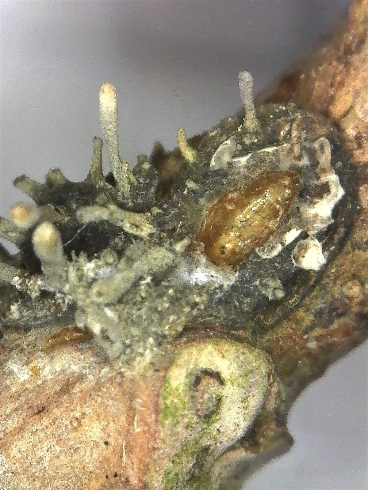 Ophiocordyceps clavulata is supposed to infect scale insects, which are herbivorous insects with intense sexual dimorphism - the females have no limbs or wings, and look like tiny flat round bumps on a twig. The males, if there are males in a given species, may have limbs and wings, and look similar to flies. I am still learning about these insects and am still quite confused, as I bet most of you are, too. They may infest plants, sucking out the plants nutritious juices and leaving wounds behind for different fungal or bacterial infections. One such infection is found on Beech trees (Fagus grandifolia) and is caused by the Woolly Beech Scale (Cryptococcus fagisuga) and a couple of native fungi called Neonectria faginata and Neonectria ditissima. There is one scale insect I have learned about which infest Juglans species and they are called Quadraspidiotus juglansregiae or Walnut Scale. The Walnut Scale females are small, round, yellowy orange in colour, and kind of squishy or wet looking. When looking at whatever is on the twig, I don’t see Walnut Scale but perhaps this is because the Bug Sputnik (the fungi) is old?