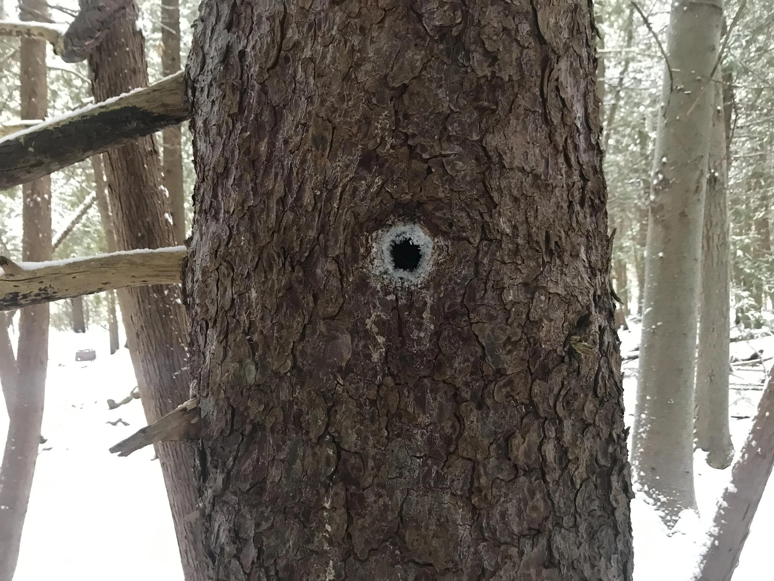 When I decided to stop trailing the Southern Flying Squirrel and head back to the Opossum trail I made my way towards and old White Pine (Pinus strobus) I knew in that particular stretch of forest. I knew this tree because I used to come by often with my students and place a nut or acorn in a small hole about 180 cm (~ 6 ft) high on the trunk. This hole is a bit smaller than the holes I have found in other trees with flying squirrels occupying them, but I have always assumed someone was inside as the rim of the hole often appeared to have fresh chew marks. Mark Elbroch writes that squirrels often chew around the rim of the holes they occupy for a couple of possible reasons. It could be that this chewing inhibits the tree from lobeing over and closing the hole or the chews could be indicative of scent making behaviour. I wonder if it could be both? Instead of 123 Pine tree lane, a squirrel marks the tree with their scent so other squirrels who come to investigate the hole knows it is occupied. When I walked by this time, something caught my eye.