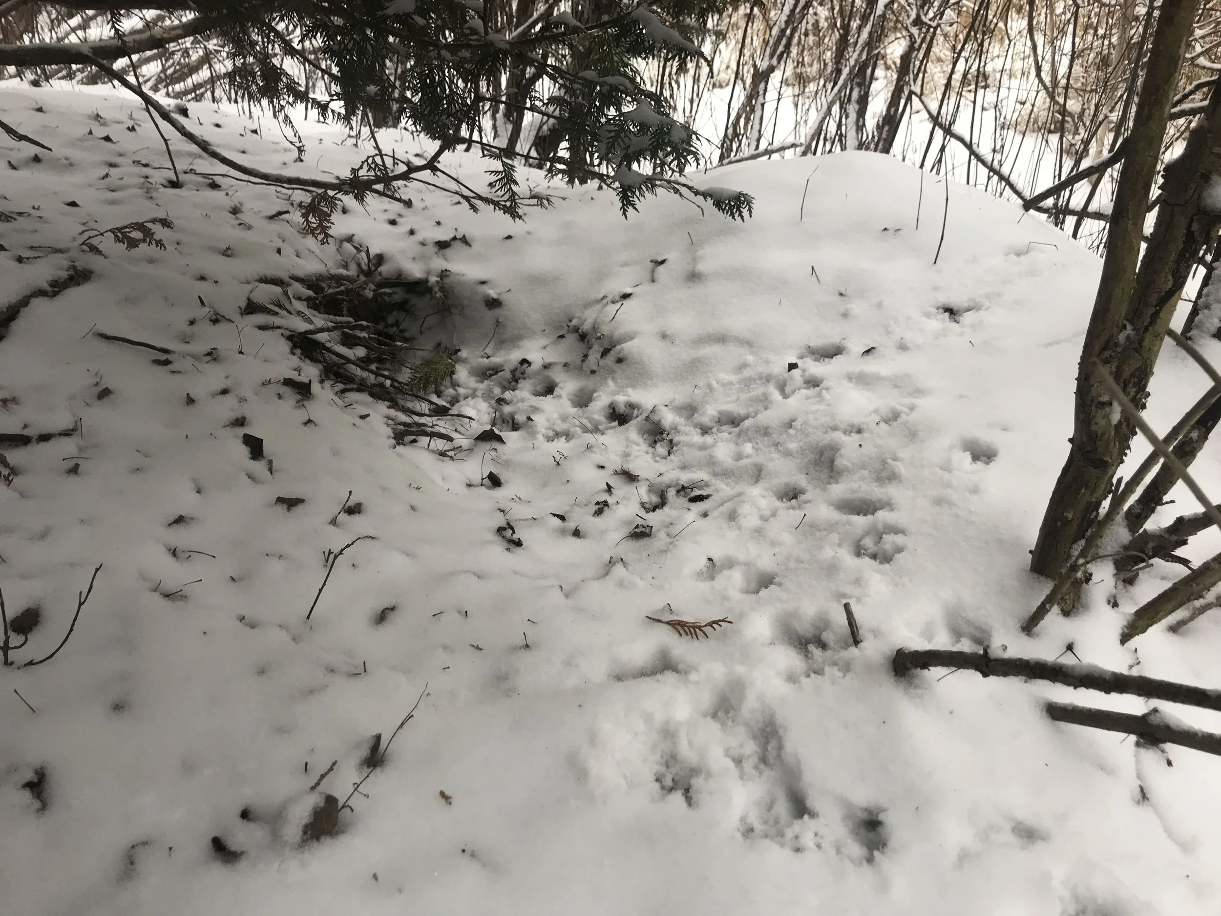 I got back on the Opossum trail and followed them over and through the fallen crown of a Paper Birch (Betula papyrifera), up to and over a couple of small spring fed creeks, and through a wetland of Phragmites australis. As I wandered through the Phragmites I realized I had walked a very similar path in this same wetland years before while trailing a Striped Skunk (Mephitis mephitis). I remembered the skunk had made their way to the other side of the wet area, up to a large White Cedar and down into a den, which when I checked, had smelled as if occupied. This time, as I made my way around the wetland I decided to avoid crawling through a thickety patch where the Opossum was headed and instead try and cut the trail and just make my way towards the cedar and see if the Opossum also had gone to check out the old hole. Turns out I was correct in my guess, and the Opossum trail went up the small hill to the base of the cedar, led right into the hole and then back out again! I was stoked. It’s nice when you can recall landscape features from years back and the trails which the animals took around that landscape to help figure out where the animals in the present will likely go. Intimacy with place pays off.