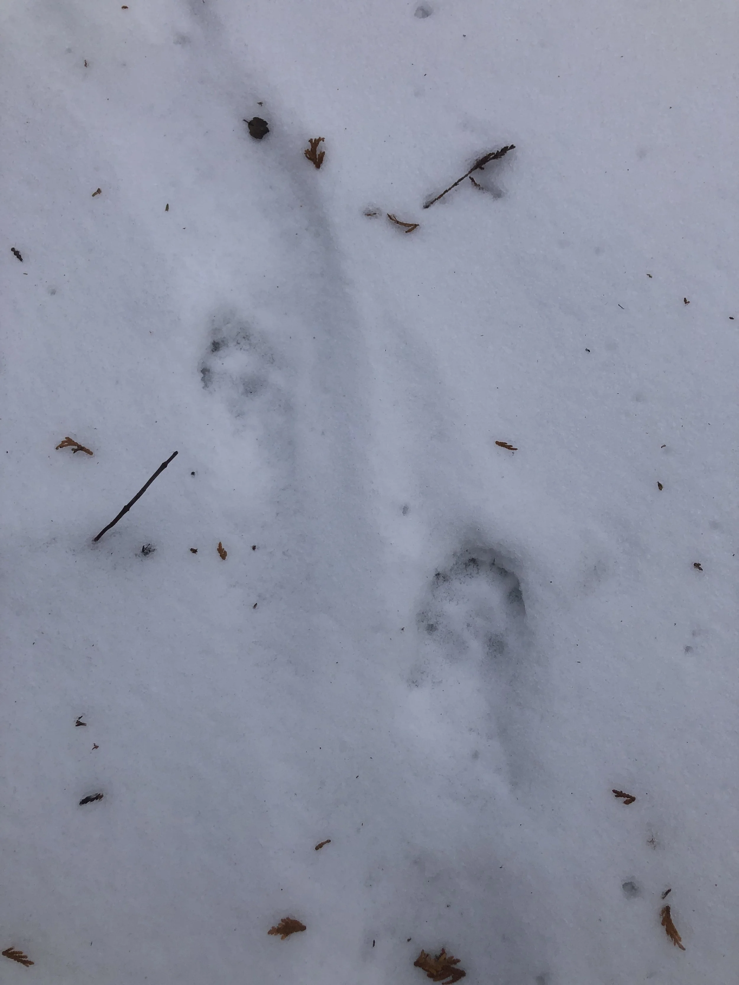 At first, I thought the trail along the far side of the river was Coyote. The trail was about a meter away from the bank, and had what appeared to be a mix of long drag marks and some foot prints within. The trail hugged a smooth slate like beach, ducked under an Eastern White Cedar (Thuja occidentalis), went on to hug an old concrete supporting wall/footing for a long since removed railroad trestle, and then off into the Cedar woods where I could not follow while the kids in my care we playing on the ice. They appeared to be investigating the edge of the ice, but never up on the land.