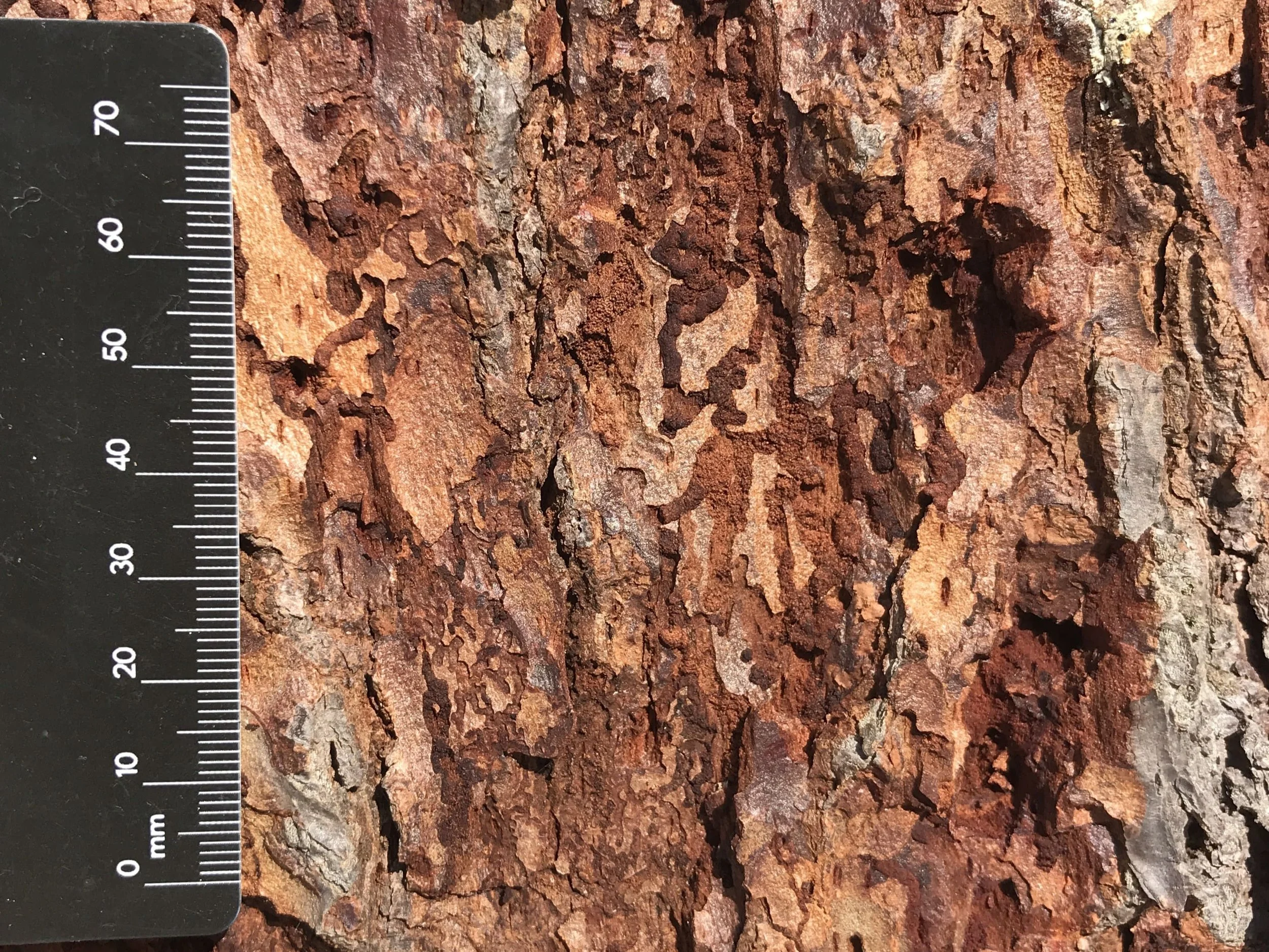 Likely galleries of the Hemlock Borer (Phaenops fulvoguttata) exposed by Black-back Woodpecker (Picoides arcticus) bark scaling.