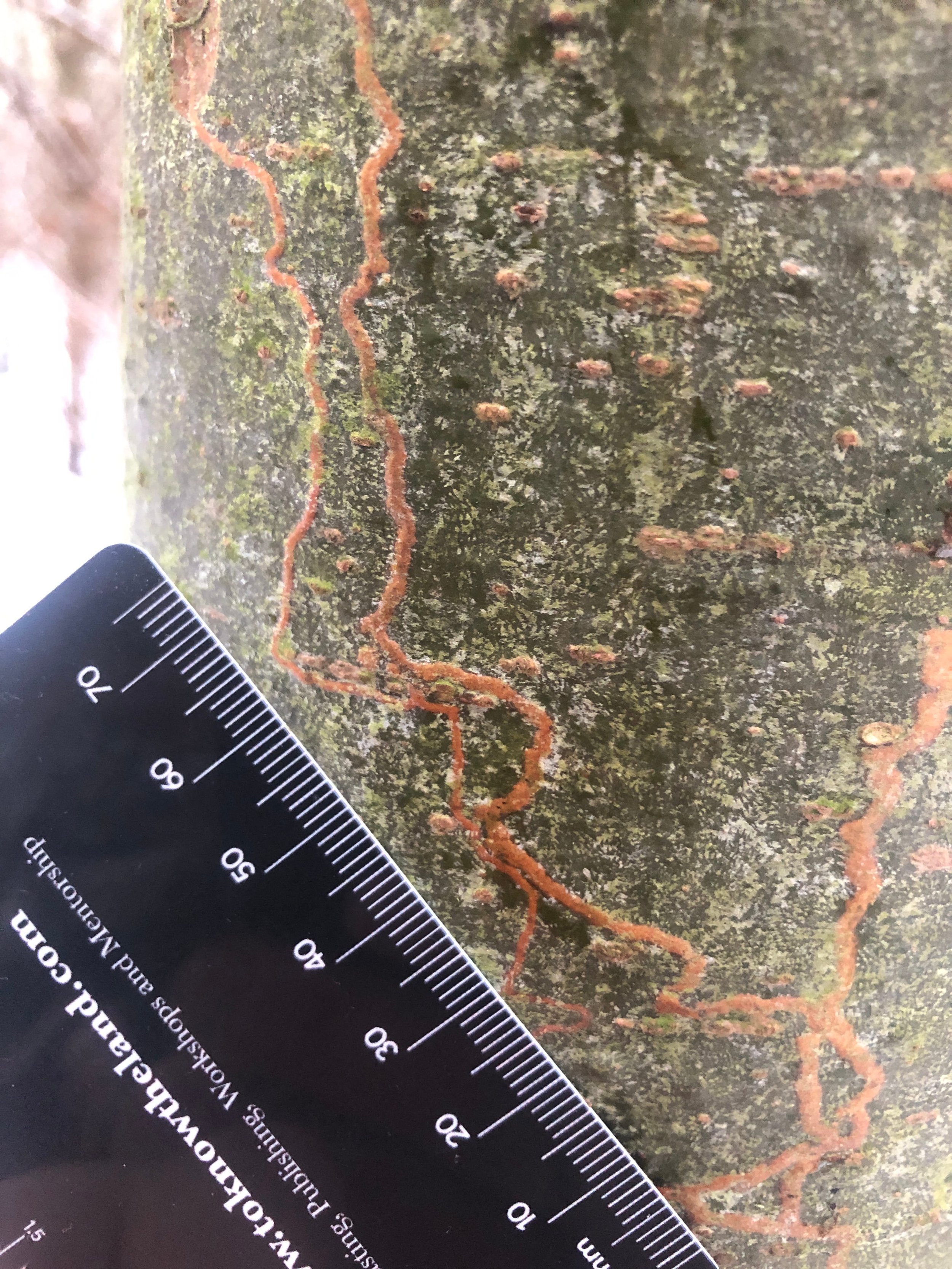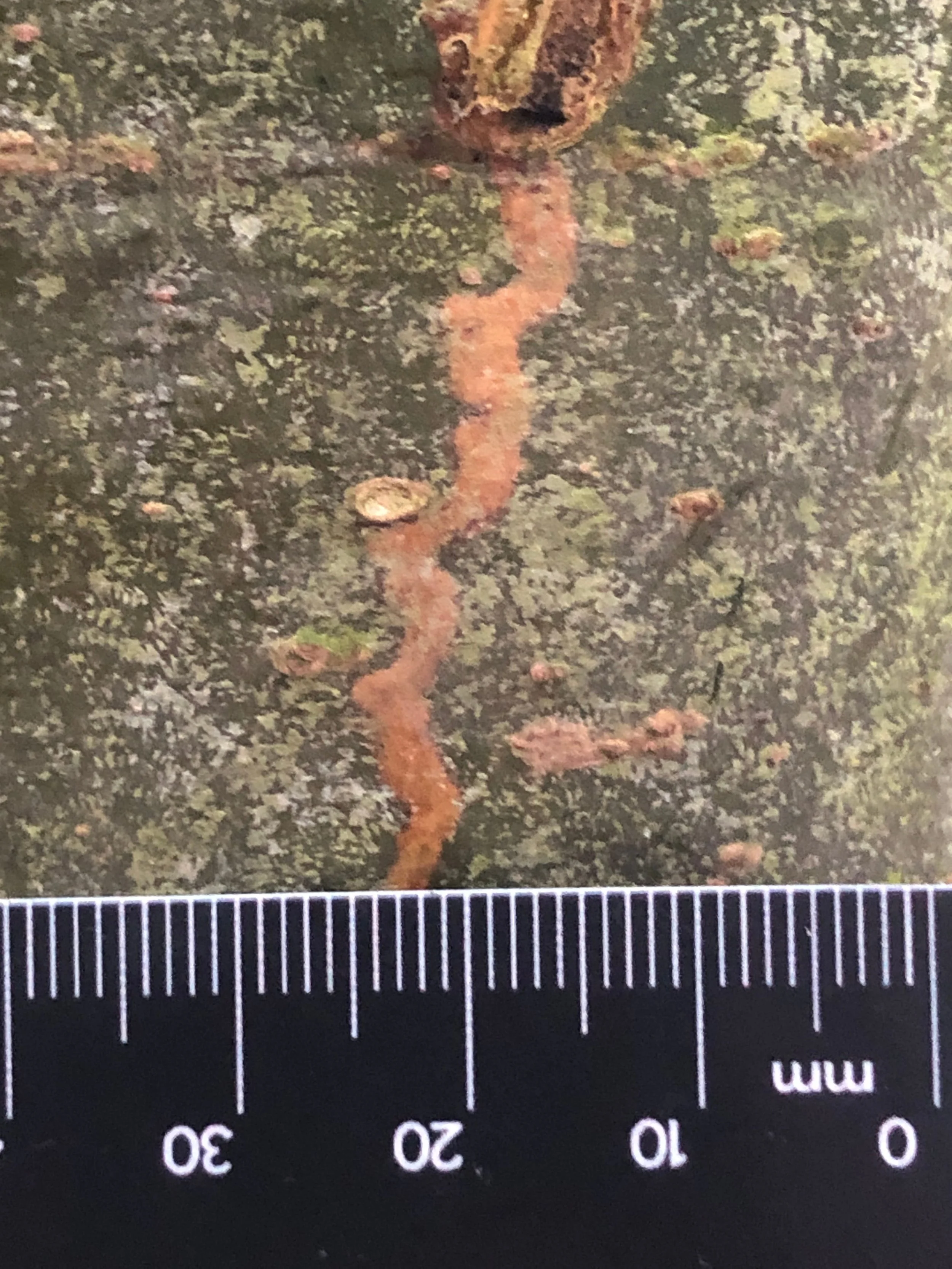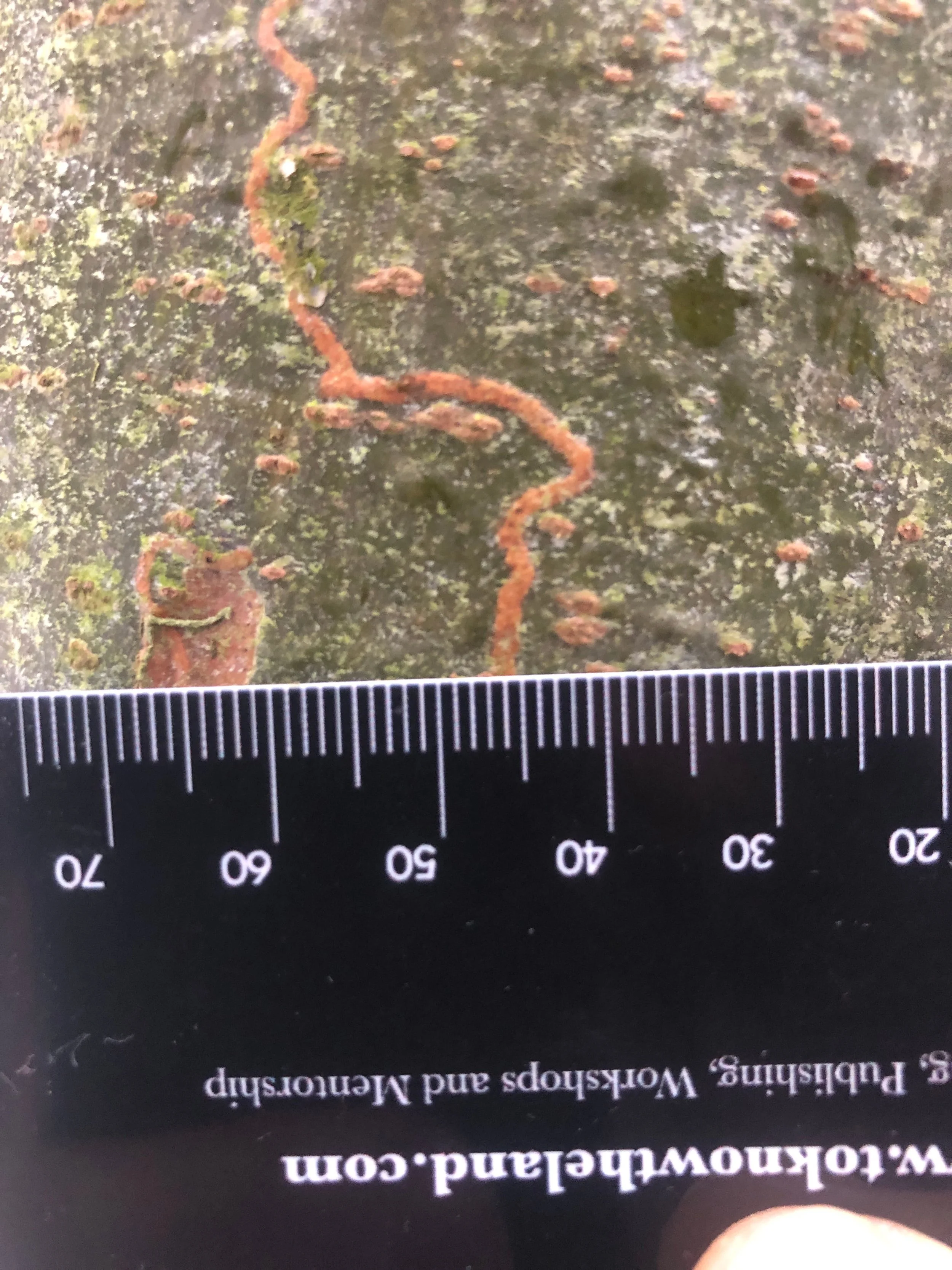 The strange squiggly line was a pale orangey-brown set against the young, green, gastropod grazed, lenticel covered bark of the White Pine. The riverine line meandered with no clear path or restriction - it just wiggled along it’s way. At the end of the line there were wider broad sections where the bark appeared to be broken or depressed.