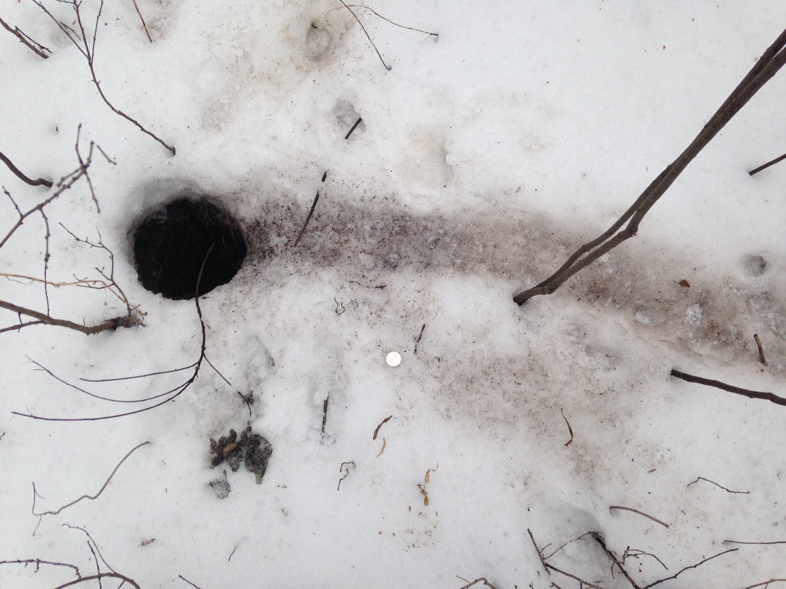 Hole, trail, scat with canadian 25-cent piece for scale (the diameter of the 25-cent piece measures 23.81 mm)