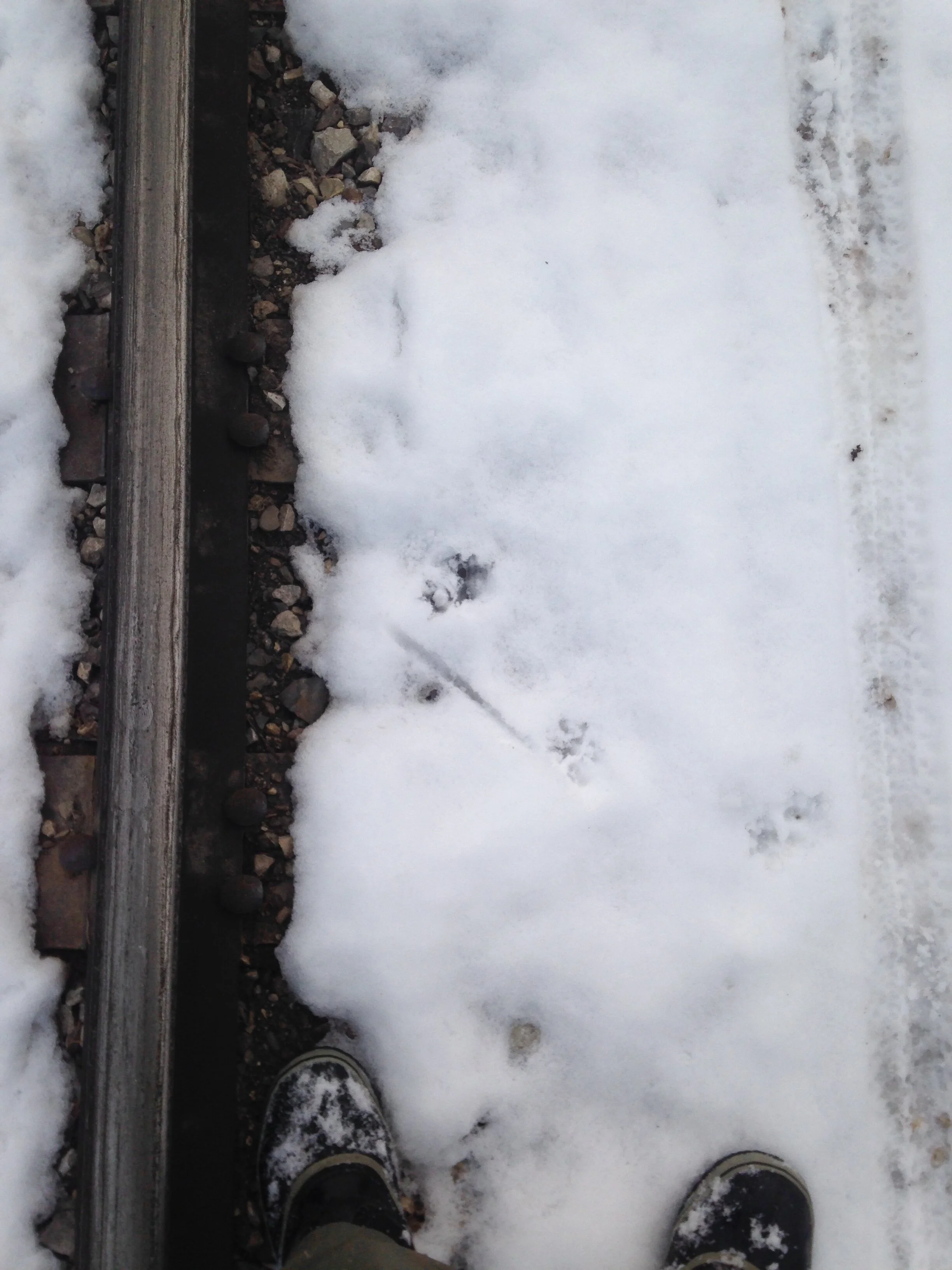 I decided that it was time to keep moving. It wasn’t too cold, maybe -1, but I felt chilly from sitting in the snow writing my journal and taking notes. I followed the trail of the animal whose trail I had journaled about and noticed that they wandered down to the train tracks, and they seemed to hop on the tracks, leaving a bit of a tail drag in the process.