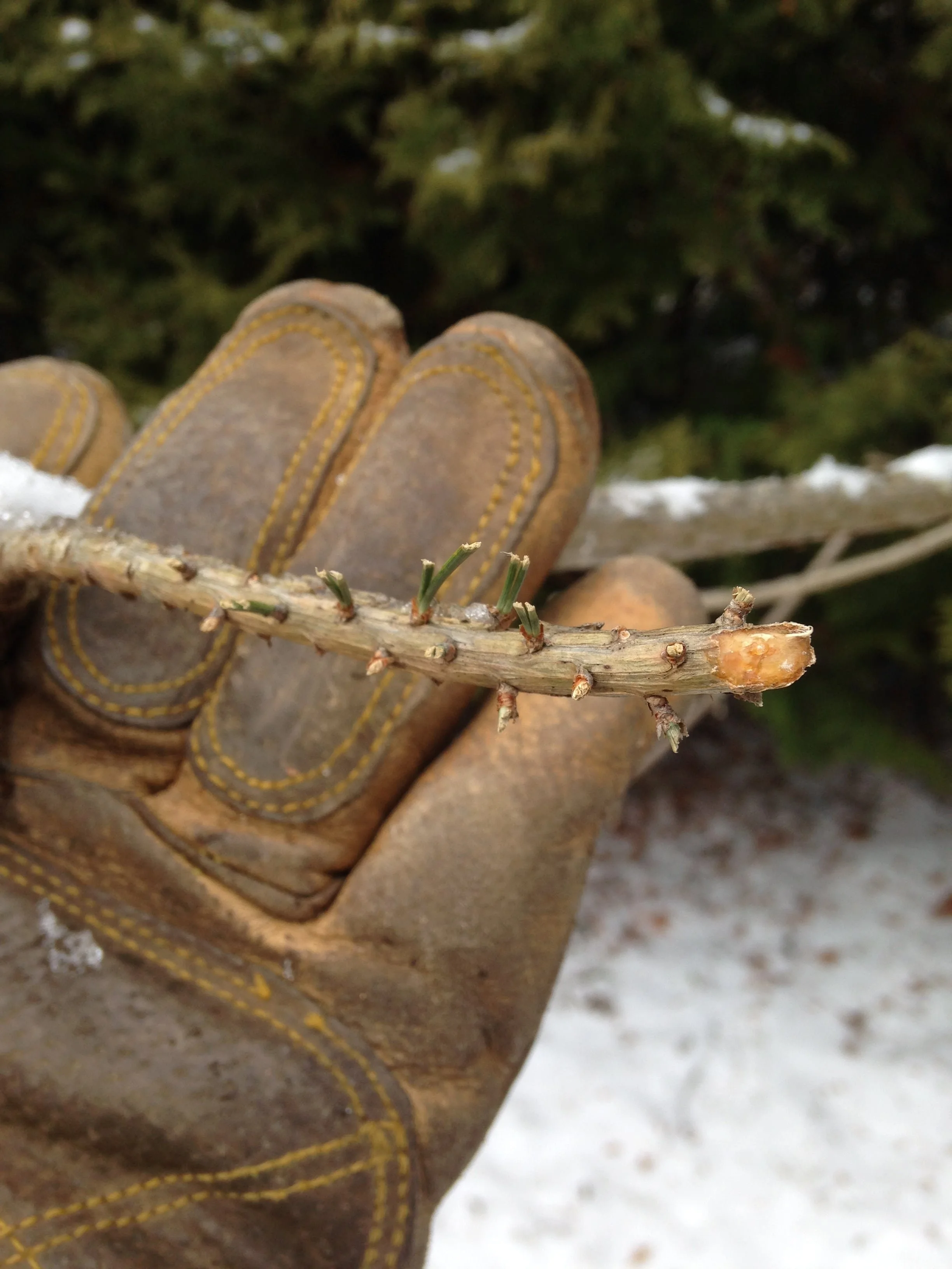 I decided to not search for the Coyote trail but make my way towards the Cedar forest as I had planned. I stopped to investigate a Scots Pine (Pinus sylvestis) branch which had fallen from an unknown source. The branch had landed atop a small Cedar tree about a meter off of the ground. The Pine needles and the branch itself appeared to have been chewed on, and the chews were all at a 45°. This led me to wonder about possible Rodents like Porcupine (Erethizon dorsatum) or a Lagomorph like an Eastern Cottontail Rabbit (Sylvilagus floridanus). There were Rabbit tracks on the ground around the base of the Cedar tree that the branch had landed on, but I couldn’t tell how old the branch was. I wonder now if a Porcupine had cut, browsed, and then dropped the Pine branch from higher up, as it was too high for a Rabbit to have access to. During colder Winters when the snow sticks around and gets high, then a Rabbit could certainly be browsing a plant that is located higher up but since the Winter around here has been so warm, the snow hasn’t gotten deep enough to really offer access for a Rabbit.
