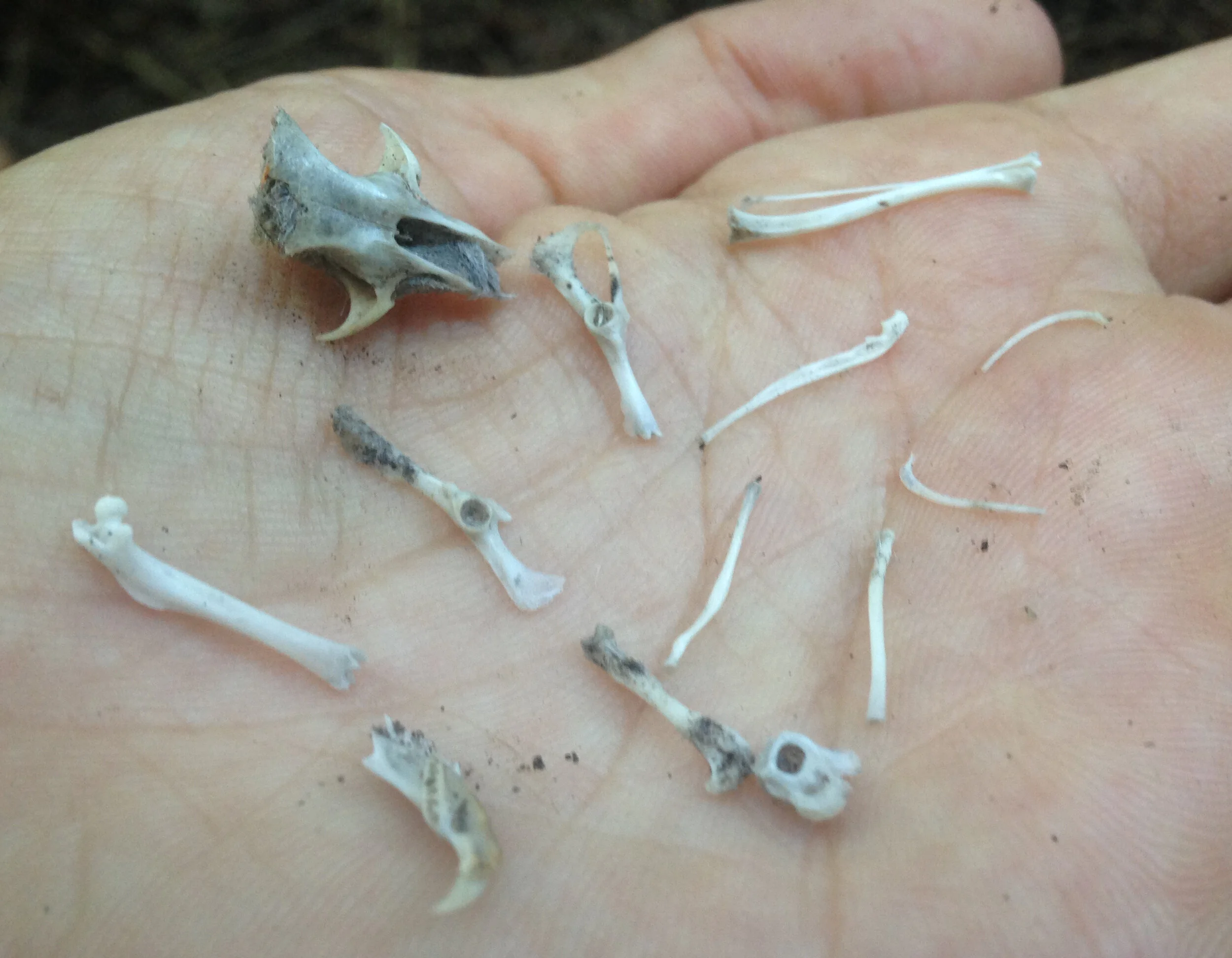 We eventually moved a little towards the SouthEast and came across some sort of bird dropping which I couldn't tell you much about. I can tell you I had seen a similar mess on the ground in a forest near to where we were tracking, but across and upstream along the river. The first day I saw the scat I thought Great Blue Heron (Ardea herodias) as I had seen a GBH along the river, no more than 4.5 m (15 ft) away the scat pile (or rather piles, as I saw maybe three of them). But this time, when I came across, again, multiple scats, we also found an Owl pellet! Immediately it was torn apart (though we could have taken the time to measure and get an idea of which Owl had left it behind). We looked amidst the remains and there were bones, many bones of all sorts, including what we thought was the smallest scapula we had ever see (on a quick second look we realized what we thought was a scapula was in fact half of a pelvis).