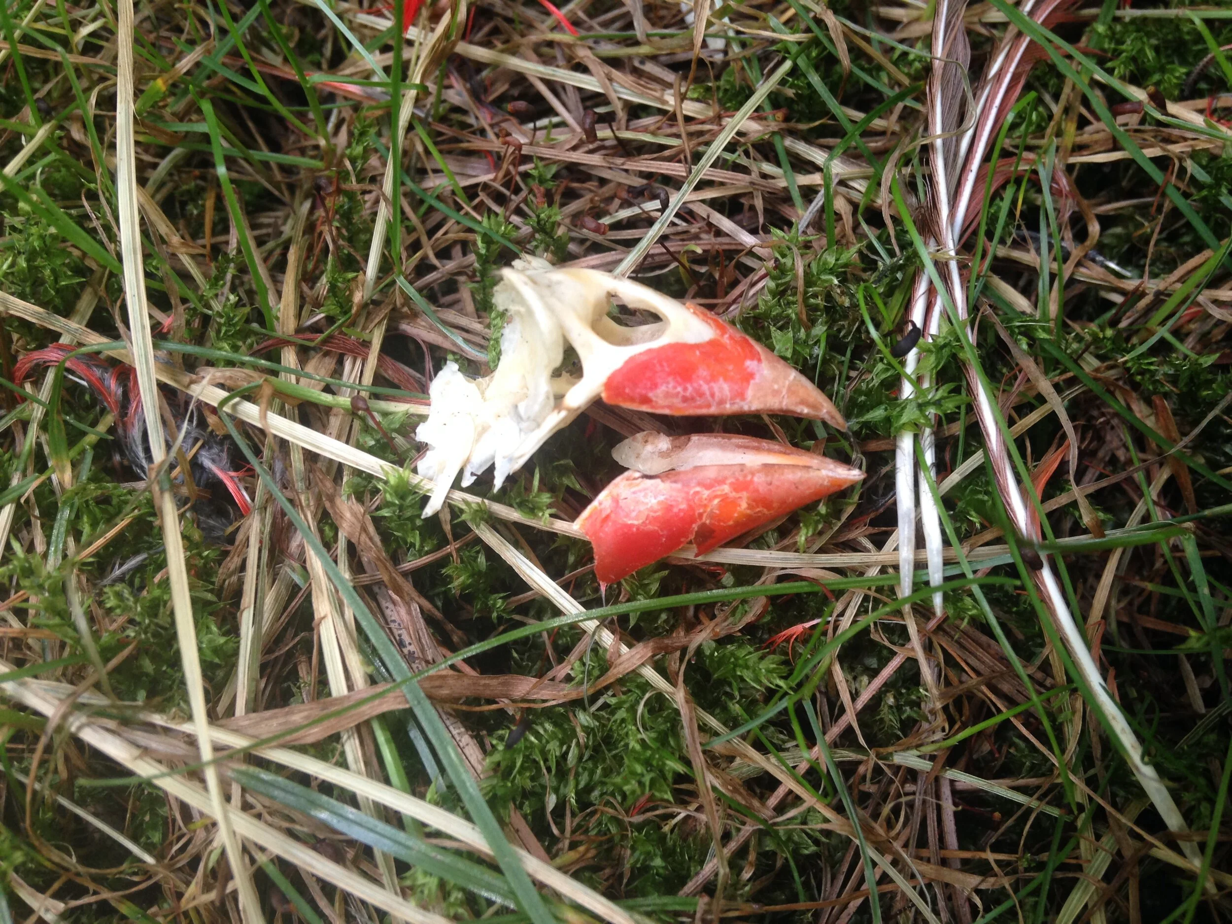 We decided it was time for lunch so we headed back to the other side of the stream and sat about and ate. 4 humans amid the noise and bustle of a late woodland summer creek. It was lovely. After about a half hour we managed to head off toward a Pine plantation of mostly White Pines (Pinus strobus) but some others as well. I think the next thing I remember pouring over were some scattered Northern Cardinal (Cardinalis cardinalis) feathers and a couple of bones. In fact there were pieces of the bill! Upper and lower mandibles, likely the hardest, densest parts of the body. We wondered for a while who might have got this bird, and where they had come in for the attack from? Was it an aerial predator? A ground predator? With no proofs, but guesses based on location, what was left behind, and the fact that it was a Cardinal... I would guess a Cooper's Hawk (Accipiter cooperii), or as I have been calling them this past week, Wood Hawks (I have even given them a new binomial : Accipter sylvestris). But I can't truly know, I am just riffing on this one, and really the not knowing has been encouraging me to check out more Pine forests since the day we went out. I've even found a couple Wood Hawk feather! Oh, and another reason? As Adrian, one of our fellow trackers was leaving, he saw a pair of Wood Hawks in the same small stretch of woods. Just another small clue.