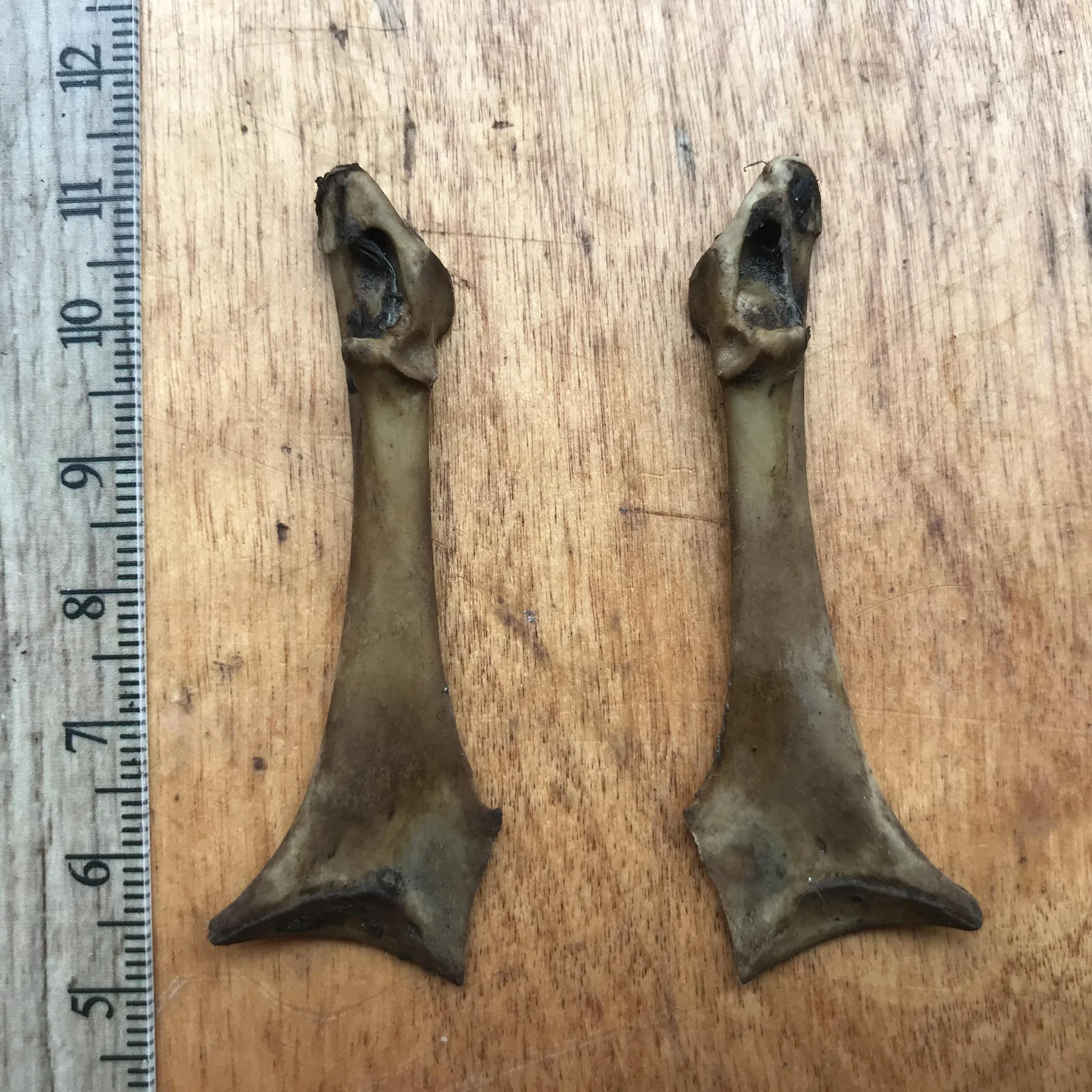When I got home, I scrubbed the bones and took some more photos so I could better see the details when comparing with the books. I also checked the books to see about the length of a primary on a Common Goldeneye. According to the Bird Feathers book, primaries for a Common Goldeneye range between 14-16.5 cm. The ones I measured came in at 16.1 cm. The high end of a primary for a Bufflehead is 13.3 cm. The ones I found were larger than would be found on a Bufflehead. I then took a look at the coracoids.